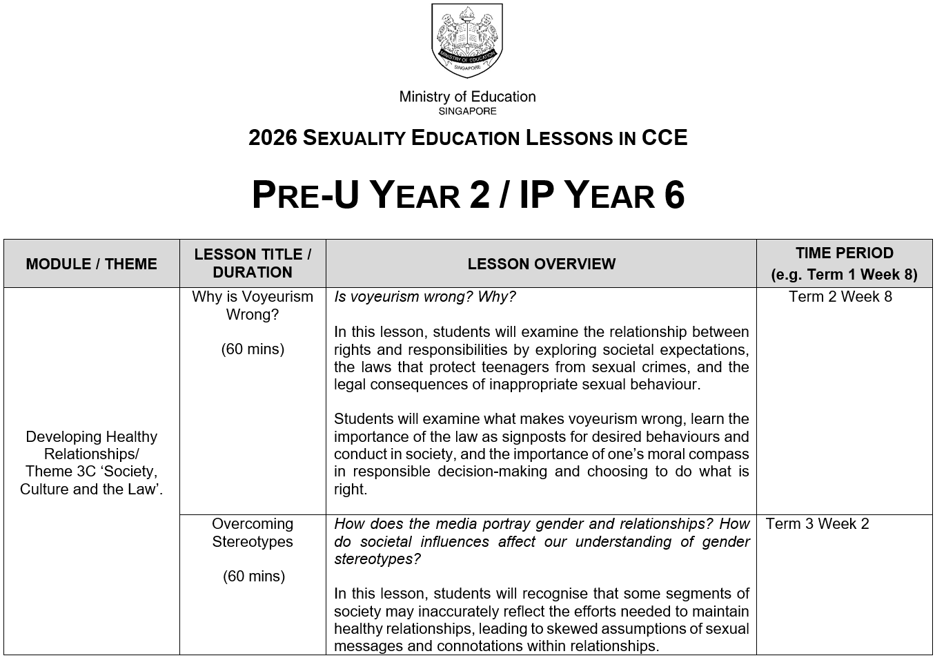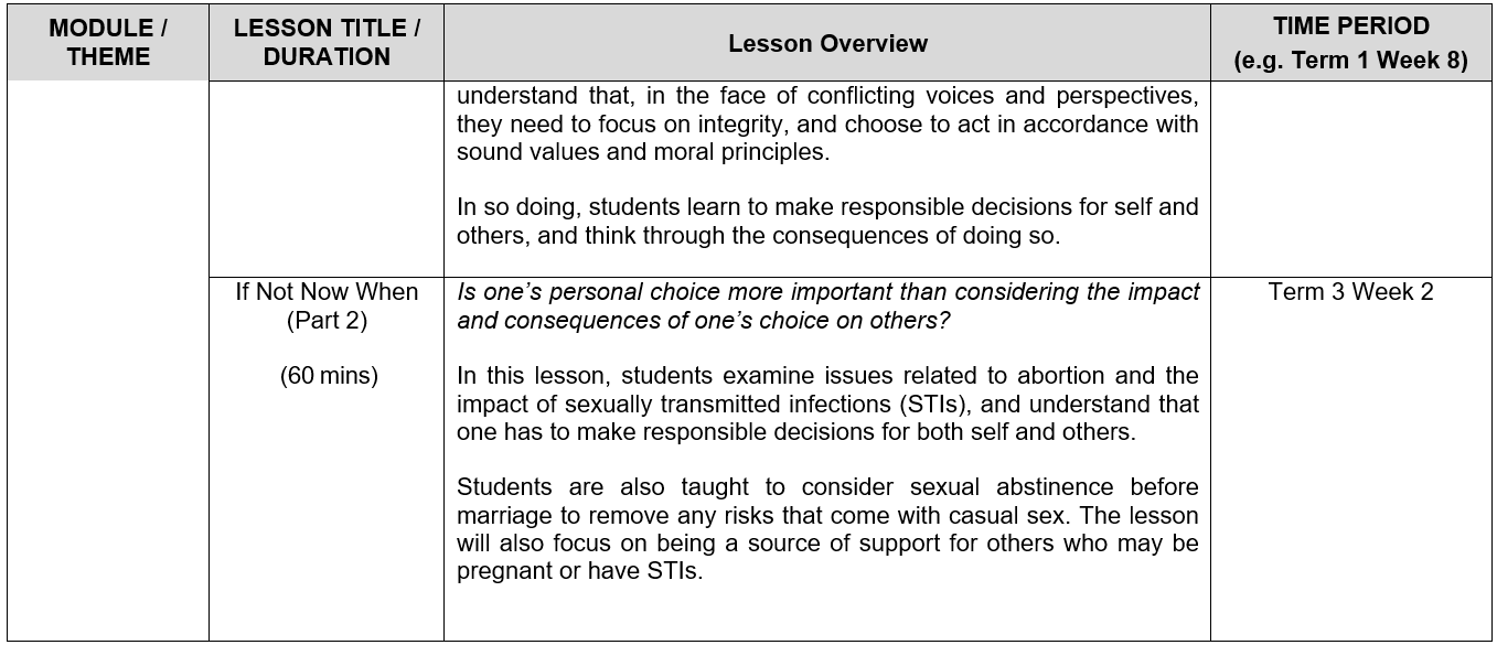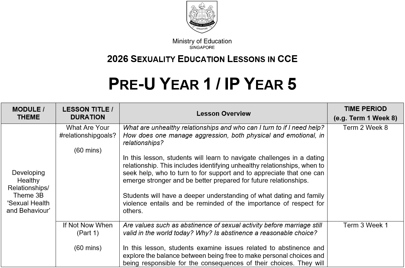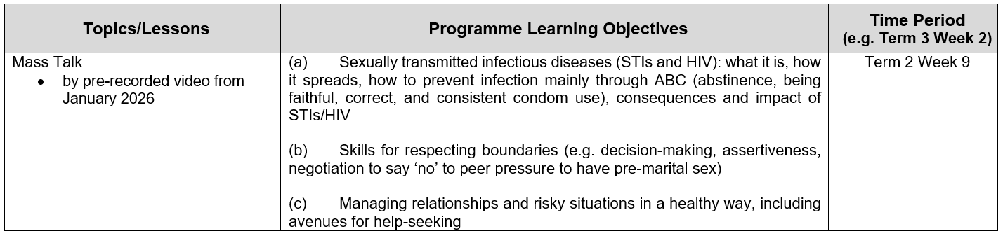 At National Junior College, the following Sexuality Education lessons will be taught in 2026: